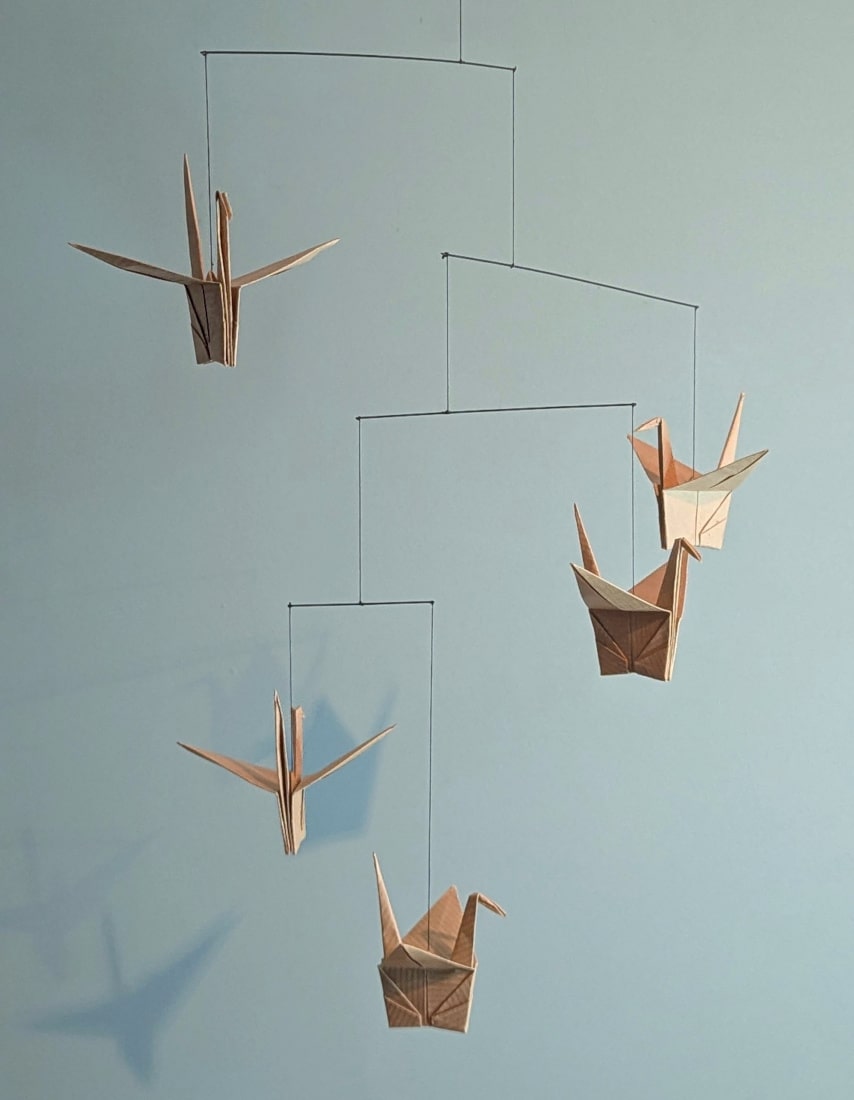 Tout en légèreté, les grues tournent sur elles-mêmes au gré des courants d’air de la maison, avec beaucoup de poésie.