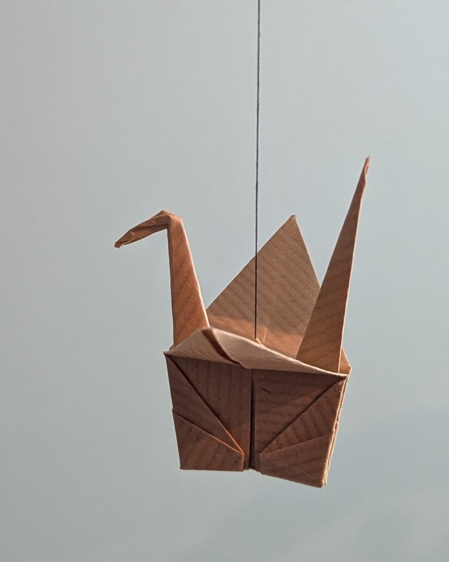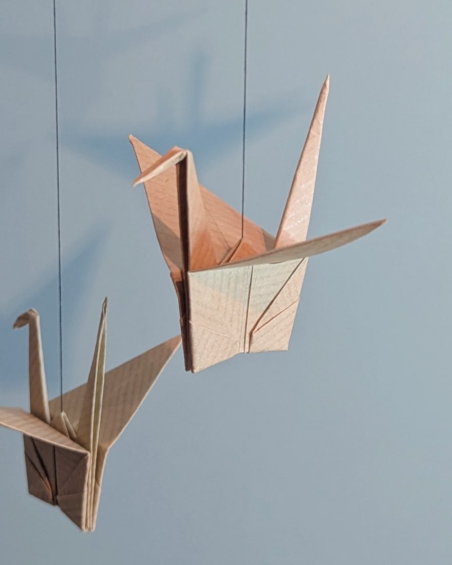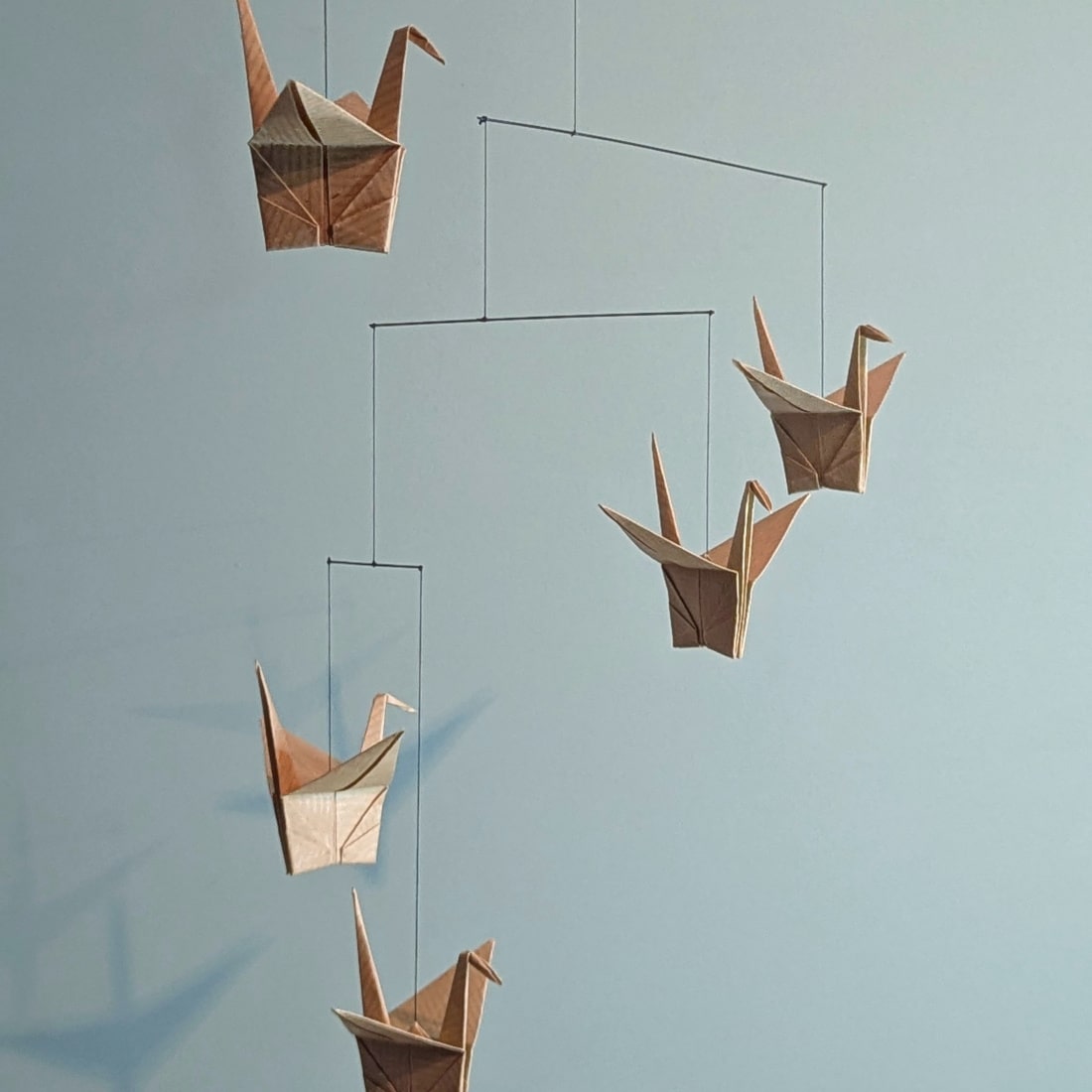 Mobile de 5 grues en origami, en papier kraft uni, idéal pour une déco bohème, fleurie ou sur un thème jungle par exemple.