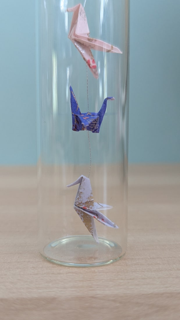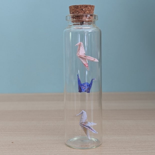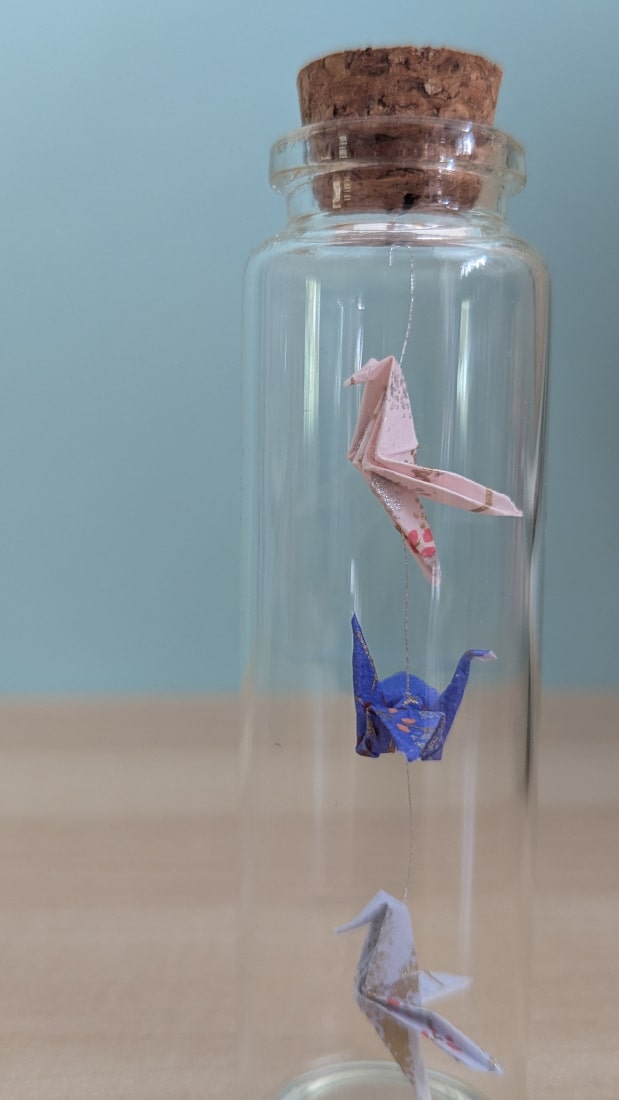 Dans cette petite fiole de 10cm, ce sont trois oiseaux en origami qui cohabitent.