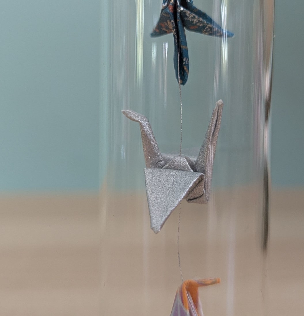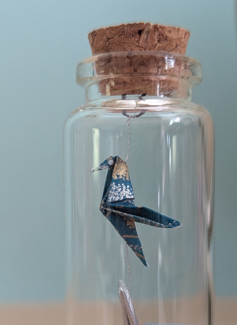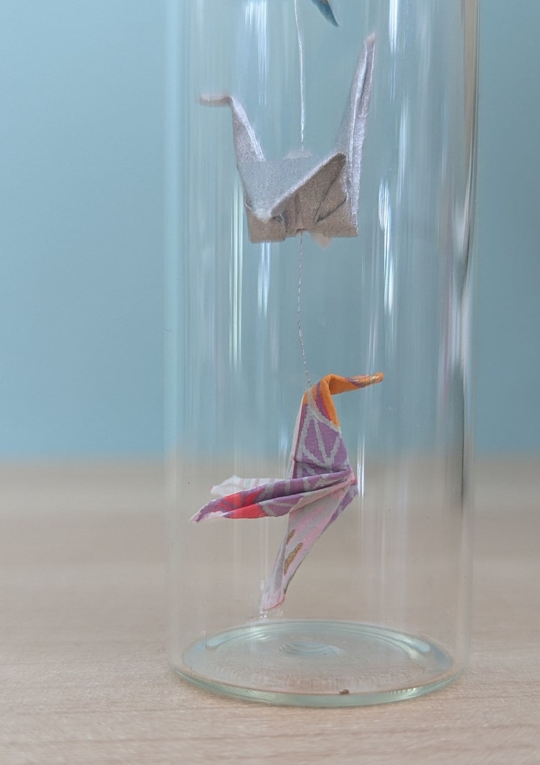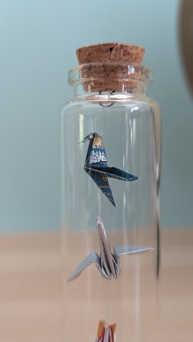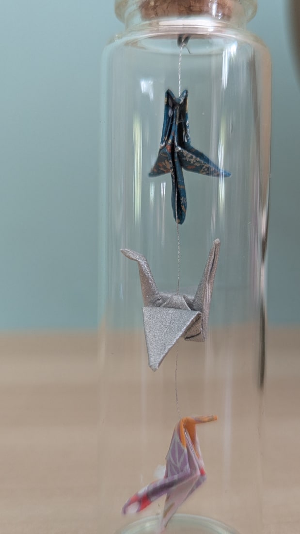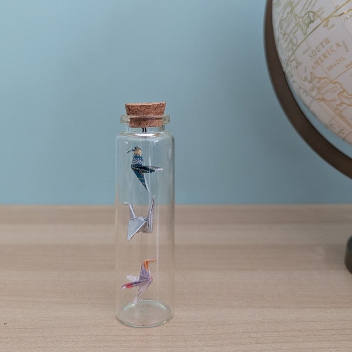 Dans cette petite fiole de 10cm, ce sont trois oiseaux en origami qui cohabitent.
