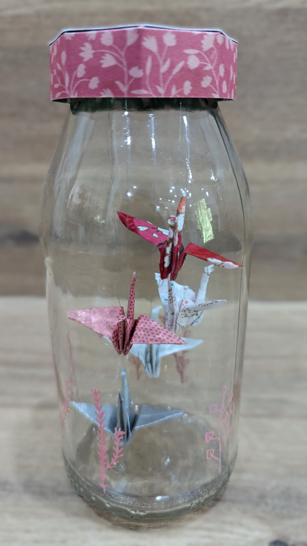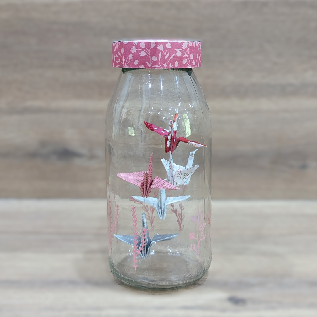 Une suspension de grues en origami, délicatement insérée dans une bouteille, trouvera sa place sur une étagère ou dans un meuble pour une décoration unique !