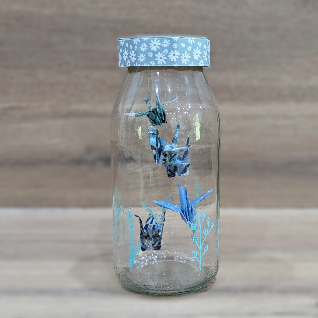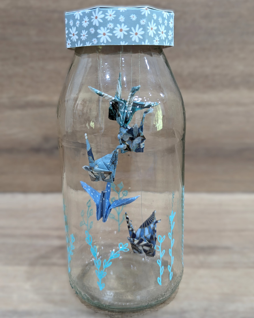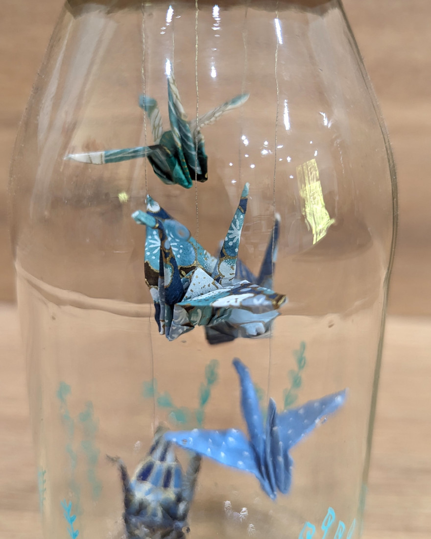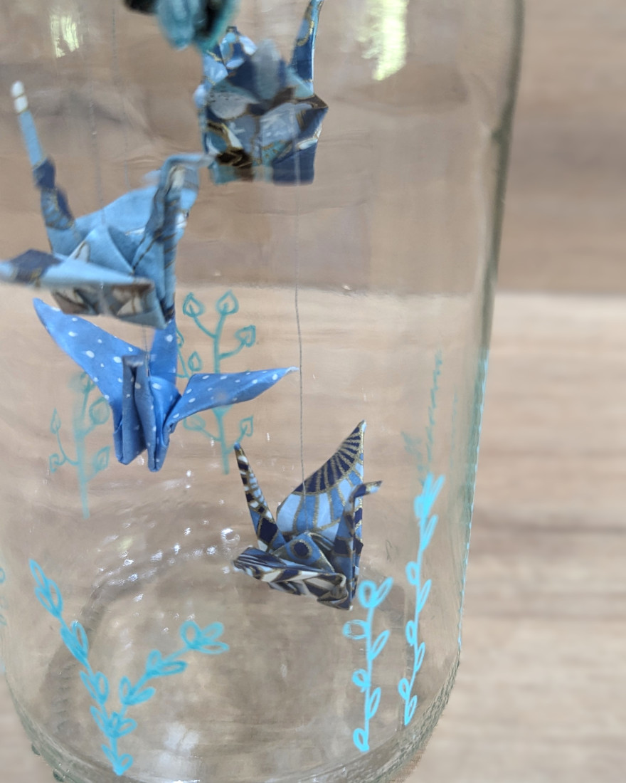 Une suspension de grues en origami, délicatement insérée dans une bouteille, trouvera sa place sur une étagère ou dans un meuble pour une décoration unique !